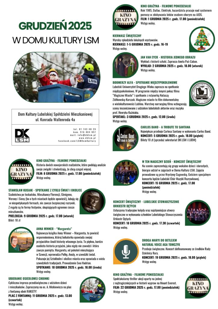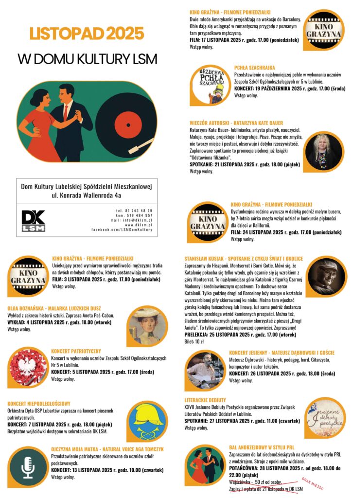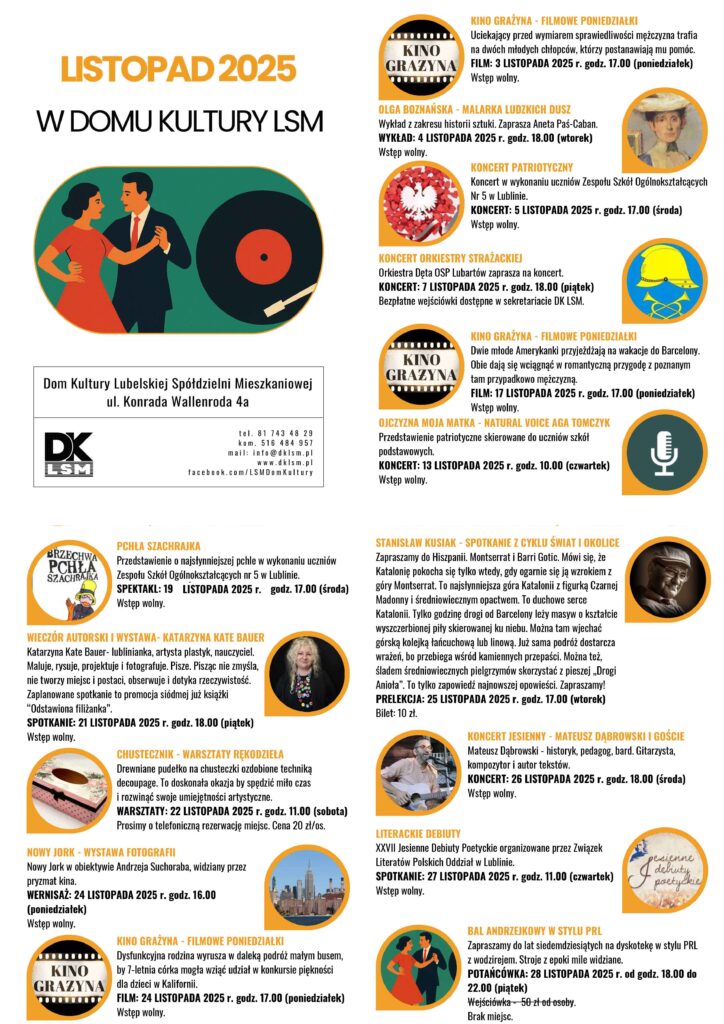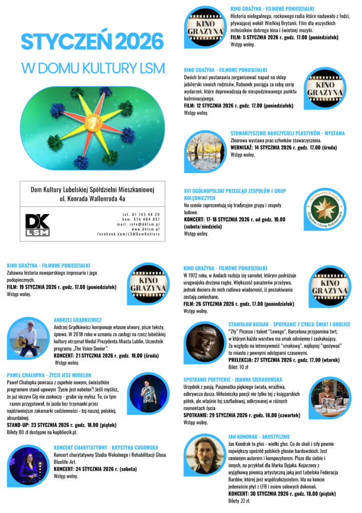 ***** Zapisy na zajęcia stałe w Domu Kultury LSM na sezon 2025/26 Zapisy na zajęcia stałe w Domu Kultury LSM na sezon 2025/26 —> ZAPRASZAMY <— ***** WYDARZENIA: KONCERTY SPEKTAKLE SPOTKANIA WYSTAWY ZAPRASZAMY