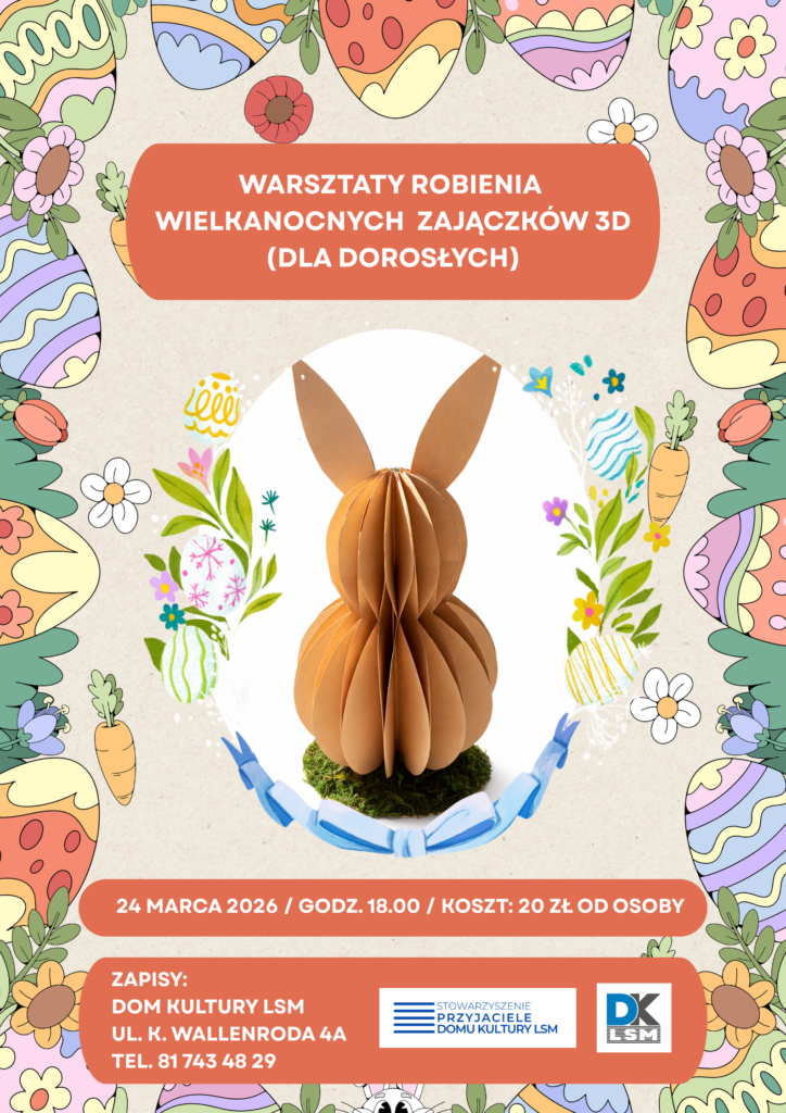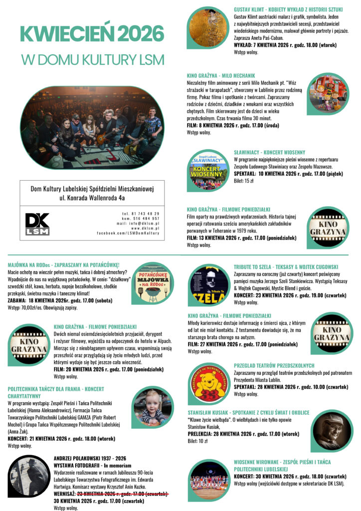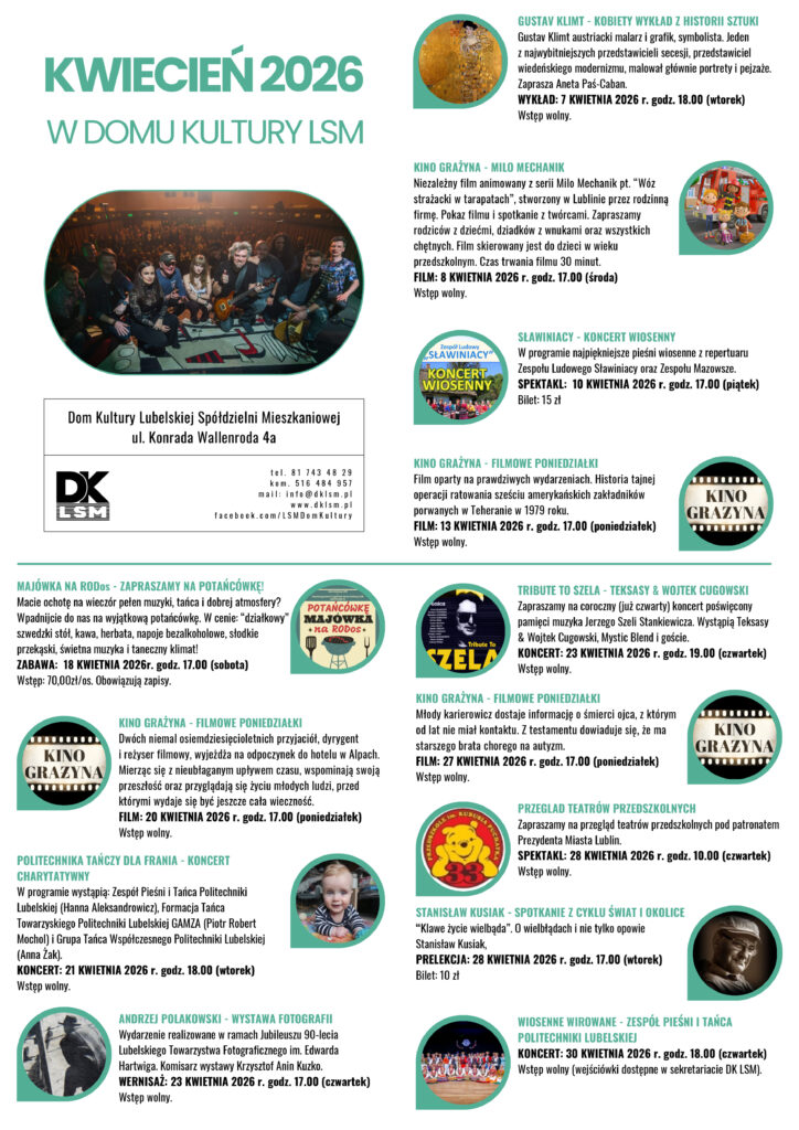 Zapisy na zajęcia stałe w Domu Kultury LSM na sezon 2025/26 Zapisy na zajęcia stałe w Domu Kultury LSM na sezon 2025/26 —> ZAPRASZAMY <— ***** WYDARZENIA: KONCERTY SPEKTAKLE SPOTKANIA WYSTAWY ZAPRASZAMY