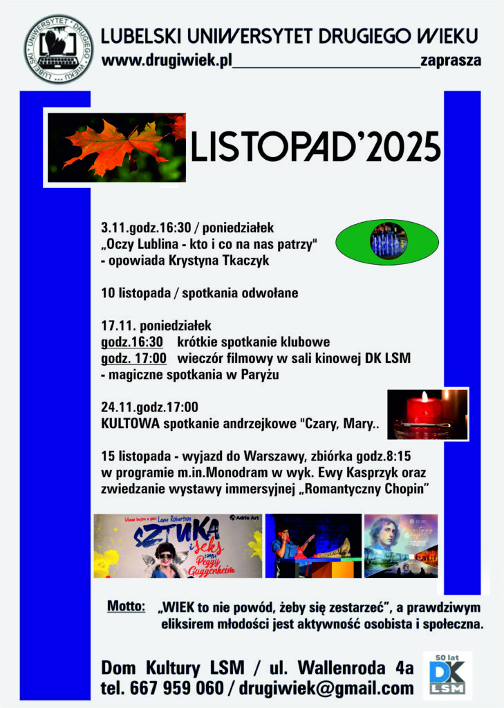 Domu Kultury LSM zaprasza wszystkich, którzy skończyli 45 lat, chcą podejmować nowe wyzwania, podążać za dynamicznie zmieniającym się światem, nawiązywać nowe kontakty i brać aktywny udział w kształtowaniu otaczającej nas rzeczywistości.