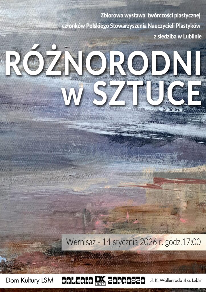 Obecna wystawa zbiorowa po raz pierwszy nosząca tytuł „ Różnorodni w Sztuce” i podobnie jak wcześniejsze nie posiada narzuconego tematu wiodącego, a wyboru prac dokonali sami twórcy. Źródłem inspiracji prac jest otaczająca nas natura. Przepuszczona przez osobisty filtr artysty wyraża się w sposobie przedstawienia realistycznym, impresyjnym czy abstrakcyjnym. Jest swoistym uzewnętrznieniem wrażliwości twórcy. Indywidualny dobór techniki wykonania sprawia, że możemy oglądać prace olejne, akrylowe, pastel olejny i suchy oraz akwarele, prezentowane na różnych podłożach (płótno , płyta, papier, szkło). Prócz malarstwa mamy także rysunek, grafikę warsztatową i fotografię. Różnorodność prac eksponowanych na wystawie wynika z osobistej wrażliwości widzenia rzeczywistości, indywidualnej jej interpretacji oraz sposobu przedstawienia przez członków Polskiego Stowarzyszenia Nauczycieli Plastyków w Lublinie. Różnorodność, oryginalność i niepowtarzalność tych prac daje nam okazję do subtelnego zbliżenia się do każdego autora, odkrywania jego idei przekazu i zanurzenia się w jego wizji. Są swoistym dialogiem między autorem i odbiorcą, który dzieli się z nim swoją wizją, refleksją i zachwytem nad pięknem świata. Dziękuję wszystkim członkom PSNP za udział w wystawie i życzę powodzenia w zmaganiu się z artystyczną materią, a oglądającym radości z obcowania z żywym obrazem.