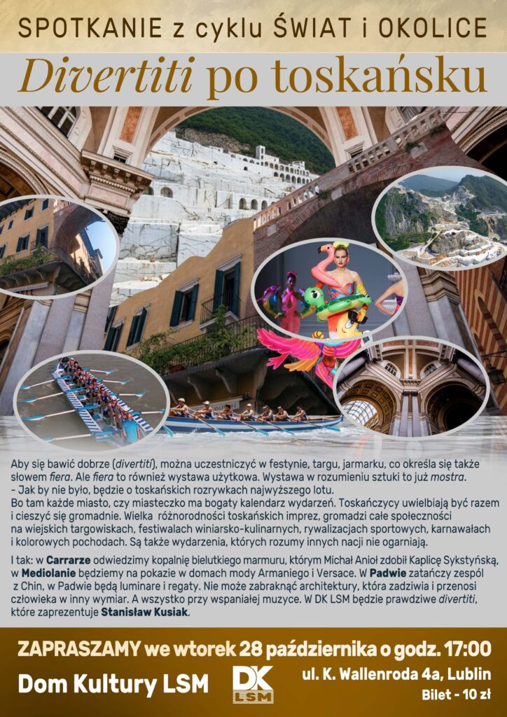 I tak: w Carrarze odwiedzimy kopalnię bielutkiego marmuru, którym Michał Anioł zdobił Kaplicę Sykstyńską, w Mediolanie będziemy na pokazie w domach mody Armaniego i Versace. W Padwie zatańczy zespól z Chin, w Padwie będą luminare i regaty. Nie może zabraknąć architektury, która zadziwia i przenosi człowieka w inny wymiar. A wszystko przy wspaniałej muzyce. W DK LSM będzie prawdziwe divertiti, które zaprezentuje Stanisław Kusiak.