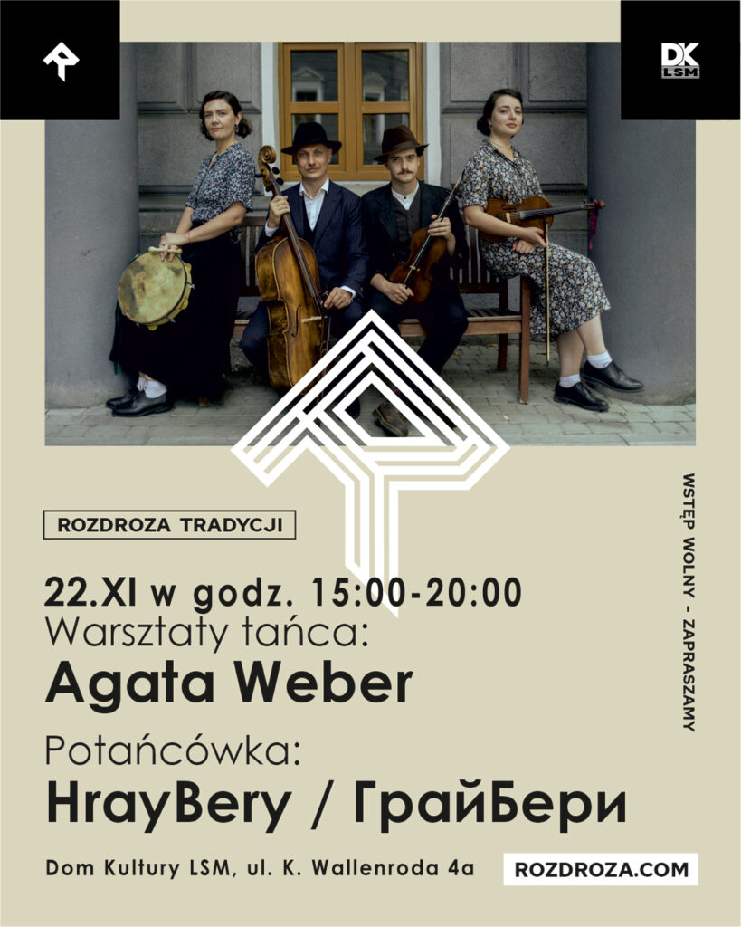 Warsztaty tańców tradycyjnych pogranicza polsko-ukraińskiego. Uczestnicy warsztatów będą mieli okazję poznać tańce, które tańczono kiedyś na dzisiejszym polsko-ukraińskim pograniczu – m.in. kozaka i kołomyjkę. Tańce te można tańczyć zarówno solo, w parach, jak i w większej grupie. Członkowie zespołu HrayBery czerpią wiedzę o tańcach pogranicza zarówno bezpośrednio od nosicieli tradycji, jak i z nagrań terenowych, materiałów archiwalnych czy zapisów etnograficznych.